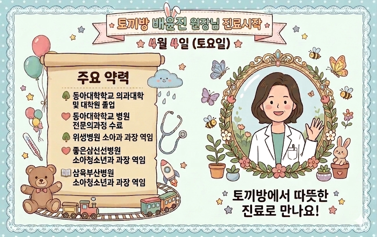 4월 4일부터 배윤진 원장님께서 새롭게 진료를 시작하게 되었습니다. 진료는 토끼방에서 진행되오니 내원 시 참고 부탁드립니다^^. 환자분들께 세심하고 편안한 진료를 제공할 수 있도록 노력하겠습니다. 감사합니다.
