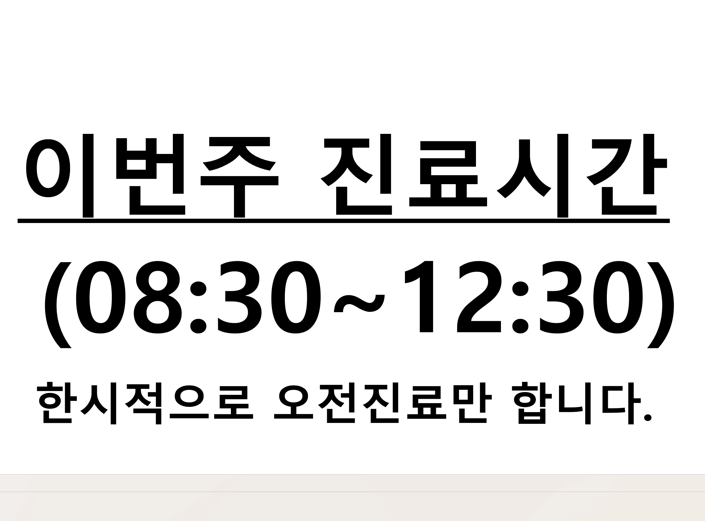 이번주는 한시적으로 오전진료만 합니다. 진료시간 ( 08:30 ~ 12:30 ) 임시기간 (3월10일 ~ 3월18일)