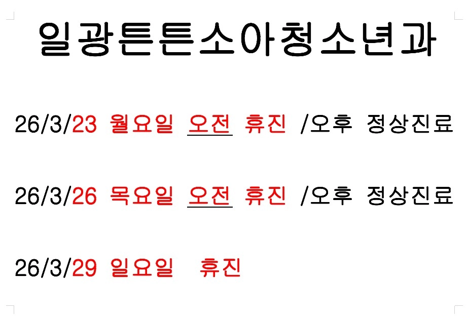 26/3/23 월요일 오전 휴진 /오후 정상진료 26/3/26 목요일 오전 휴진 /오후 정상진료 26/3/29 일요일 휴진