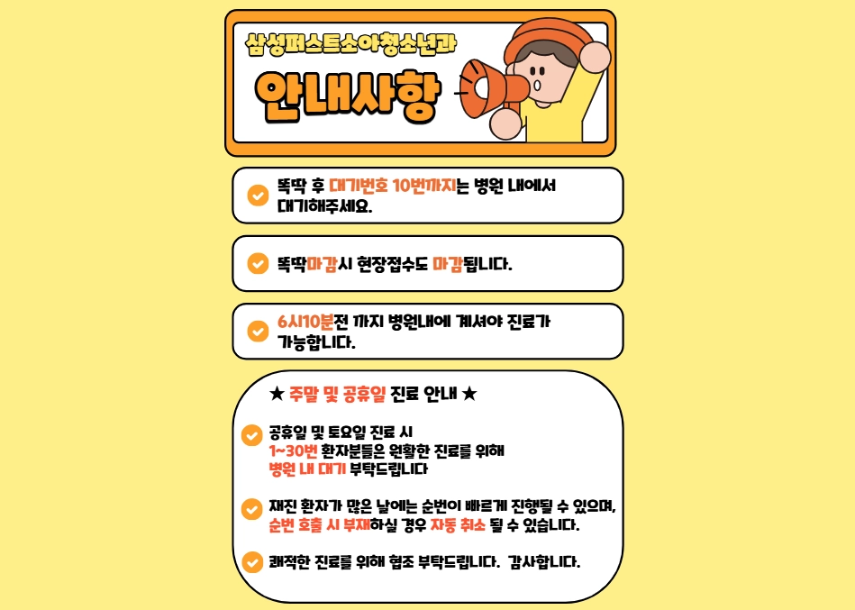 *똑닥 마감 시 현장 접수도 '동시 마감'입니다* 1. 본인차례에 내원하지 않을 시 자동 취소 -> 순서에 내원하지 못 할 경우 미리 접수 하지 마세요. 2. 전화 접수, 보류 불가 -> 순서에 맞춰서 내원하세요. 3.한시적으로 똑닥 접수후 오전12시,오후6시까지 내원하지않을시에 일괄 취소됩니다.(재접수 불가) 상황에 따라 똑닥 마감,현장접수 마감이 일찍 될수있으니 참고해주세요.