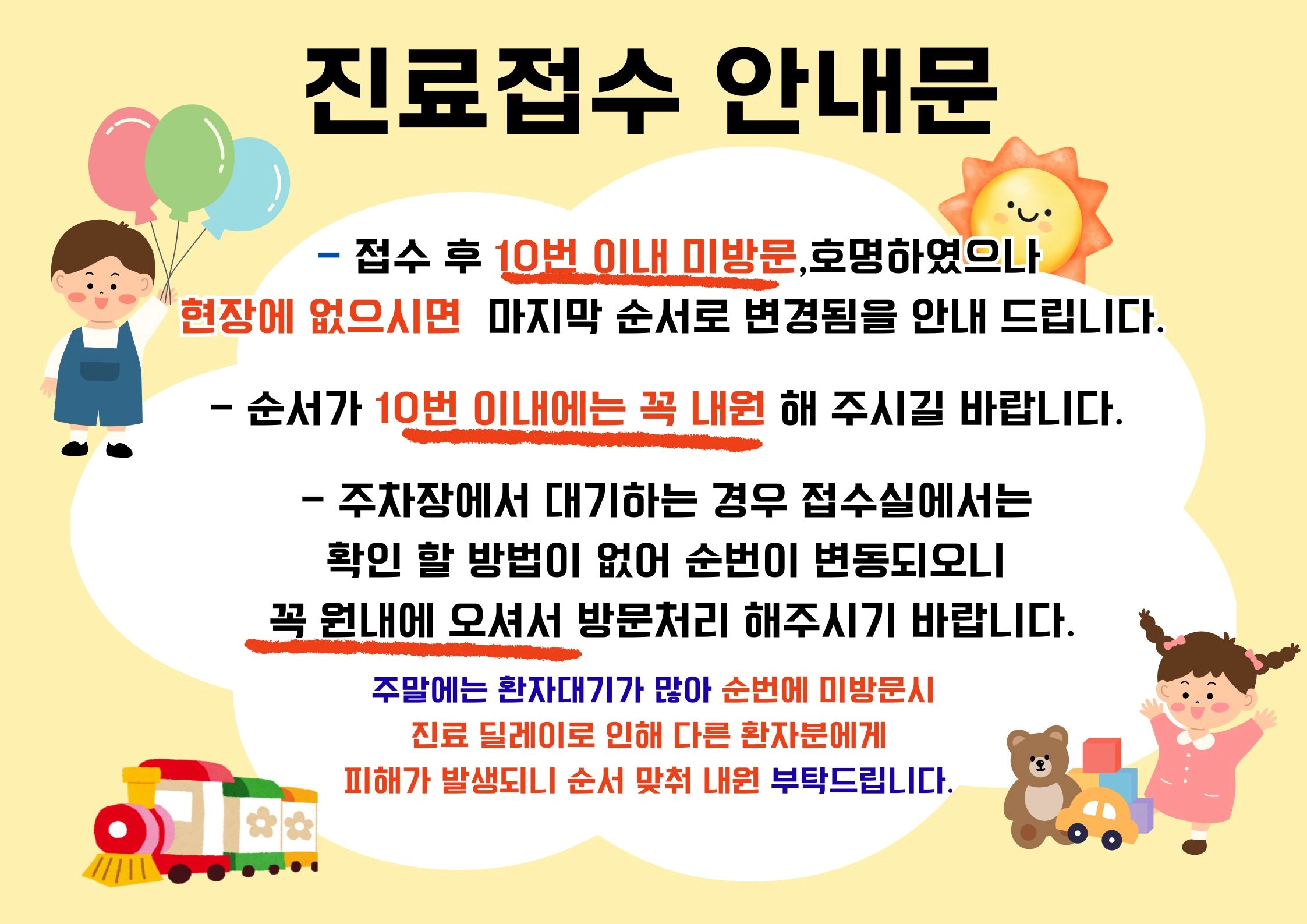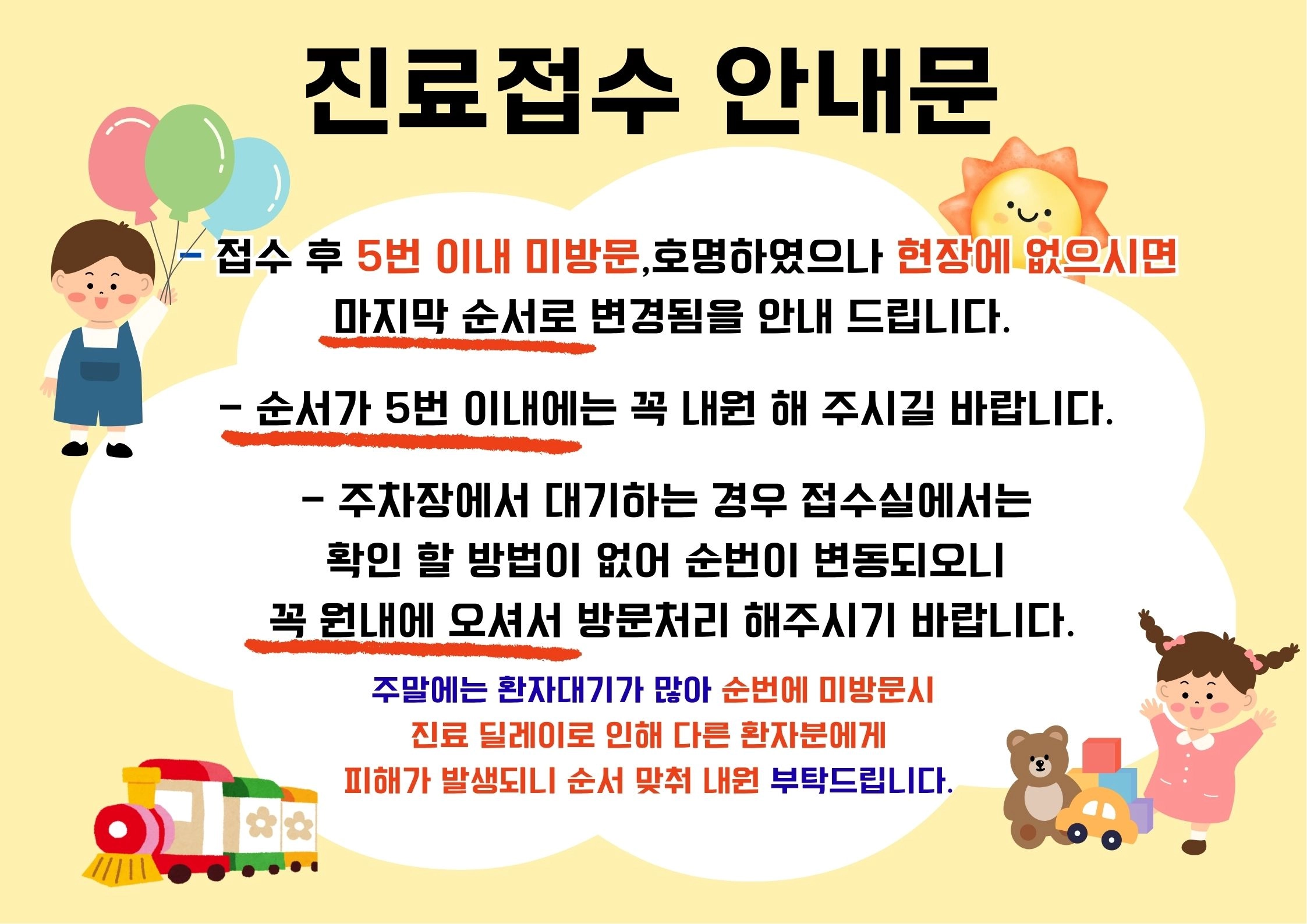 *야간진료접수 17:20 / 시작 18:00 *야간진료 21시까지입니다. 21시 이내로 미내원시 자동취소됩니다. ★ 필독★ 순번 10번이내에는 꼭 내원해주시길 바랍니다. 미방문으로 진료지연이 됩니다. 순번에 미방문시 접수취소또는 마지막 순번으로 변경 됩니다. 주차장에서 대기하는 경우 접수실에서는 확인 할 방법이 없어 순번이 바뀌니 꼭 원내에 오셔서 방문처리 해주시기 바랍니다. *예방접종시 아기수첩 지참하여 내원 부탁 드립니다