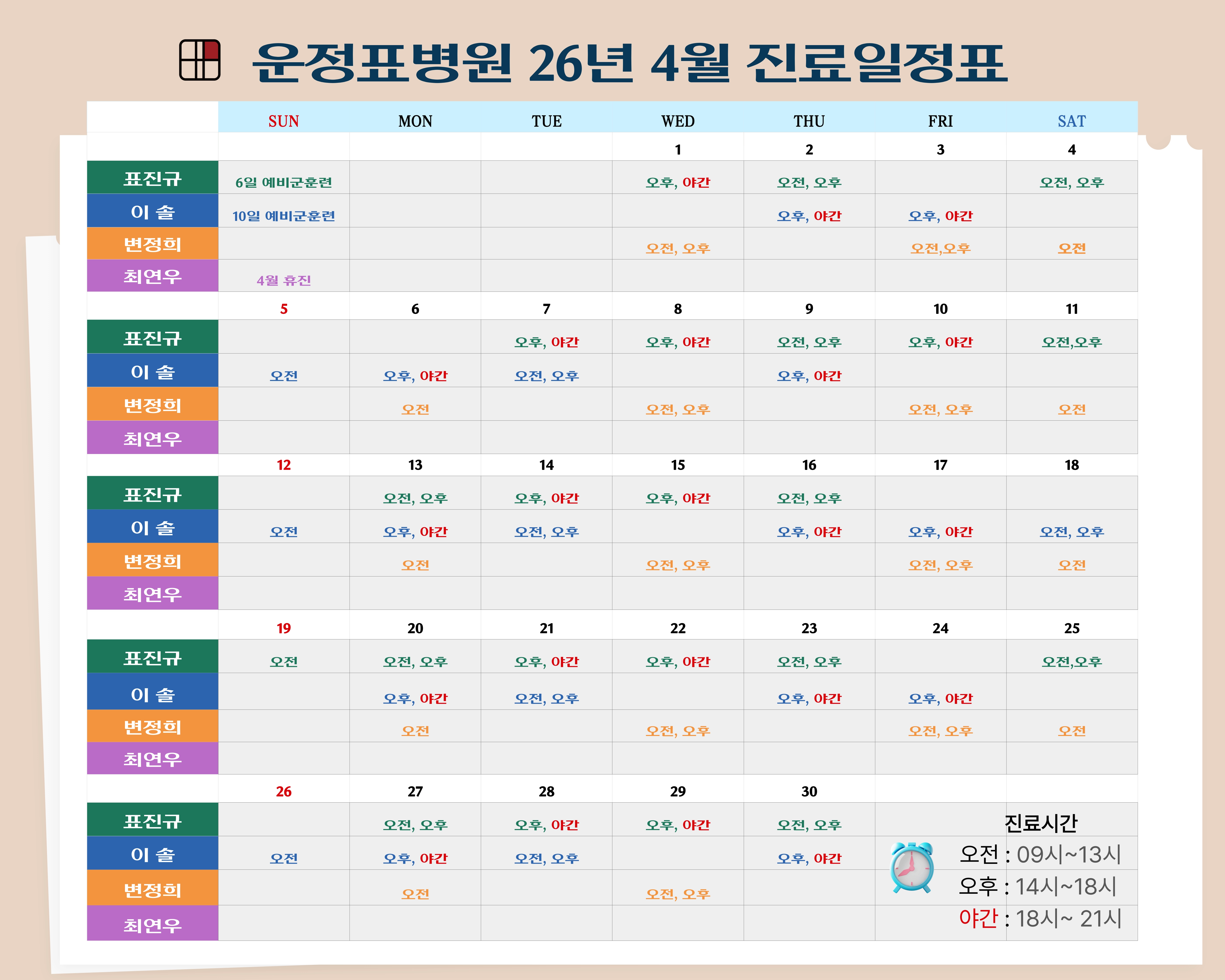 4월10,11일 예비군훈련으로 휴진합니다. 검사결과설명 및 보류환자로 인해 보여지는 대기순서와 다를 수 있습니다.